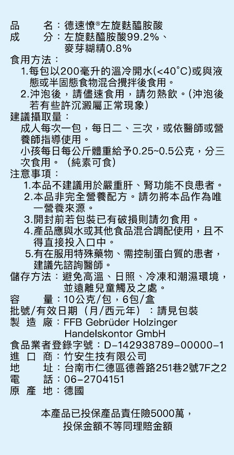 德國德速憭左旋麩醯胺酸10克 × 50包 加贈10克 × 6包 成分:左旋麩醯胺酸99.2%、麥芽糊精0.8%